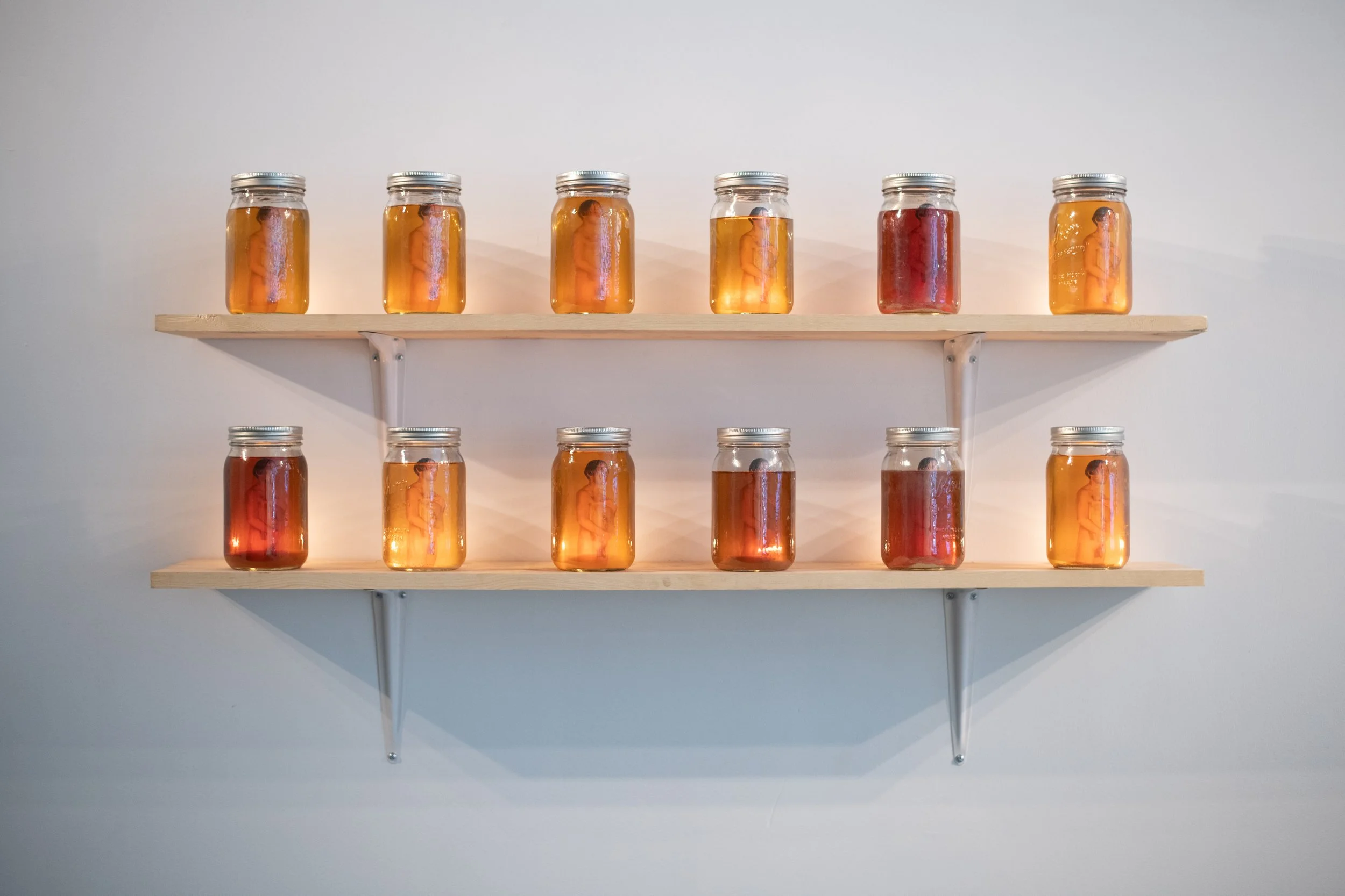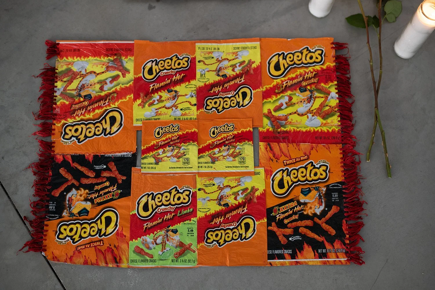 One way to repair a dug hole is to put back the soil that was displaced to create it. The constituent elements remain the same, but the configuration is new and transformed–indeed affected by violence, but not necessarily in denial of it. An untitled piece in the corner of the gallery takes the once-oppressive, stereotype-conjuring materials of Fabuloso and empty Hot Cheeto bags and arranges them in an altar-like setting. White pillar candles–at once a representation of new beginnings as well as Catholic symbol of purity–burn atop an empty crate that once held oranges; the aroma of Fabuloso wafts through aromatic reeds that disperse its scent; Hot Cheeto bags sewn together into a floor mat create a place where one feels almost compelled to kneel and rest before a raised image of a dug hole. Stone and manzanarez offer a new, disidentificatory configuration of the materials that previously stereotype their heritage. In this altar–visually similar to an ofrenda, or an offering for loved ones lost–reclaim the materials in honor of those that have come before them, those that contributed to their heritage and identities they embody today.