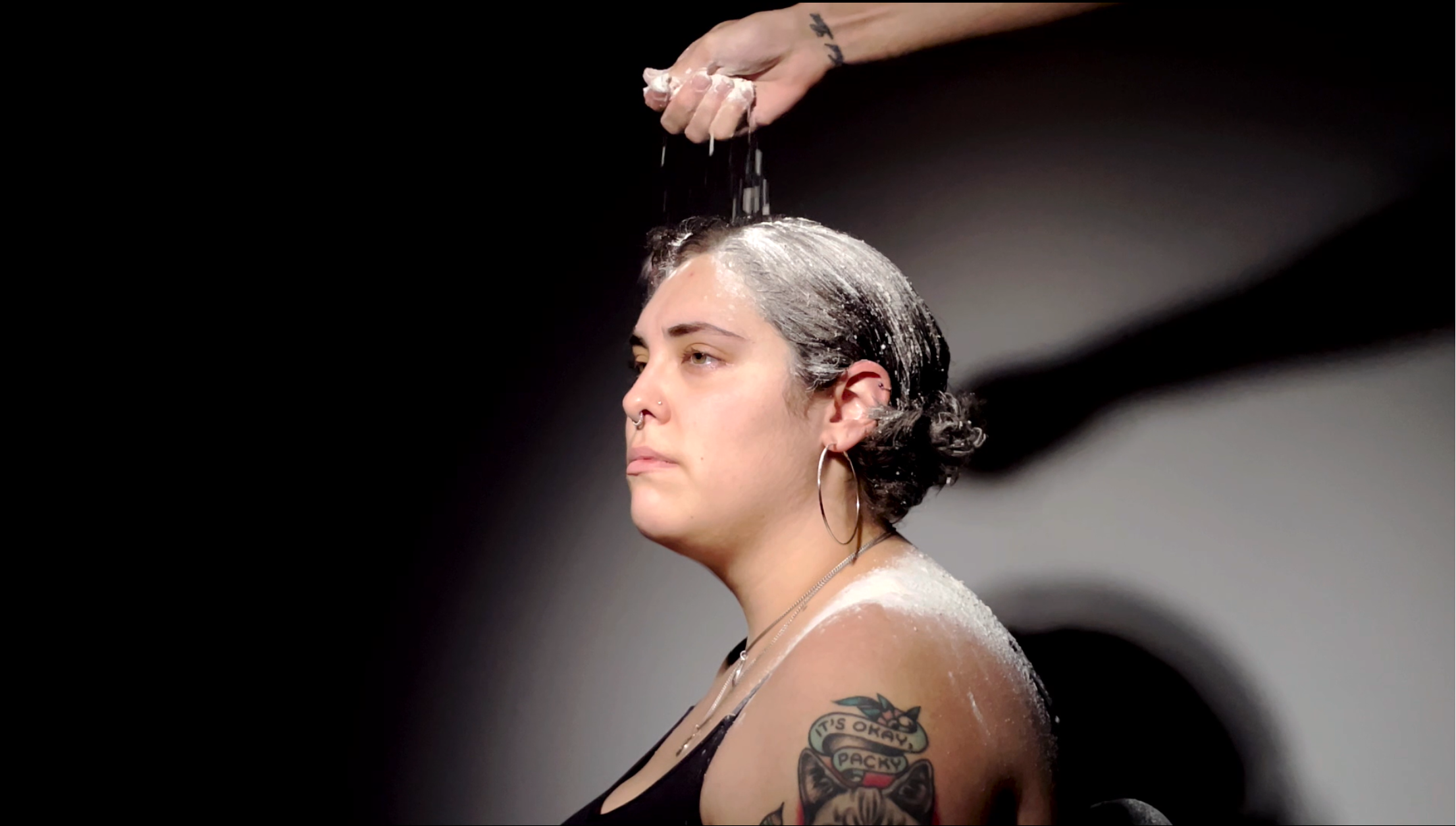 As we continue to dig, we see the way these materials are not just indicators of socioeconomic and racialized identities, but develop into agents of subjugation. National Anthem shows Stone’s hair combed and lovingly caressed by hands, an act of care familiar to many loving parent/child relationships. As the video progresses and the national anthem of the United States of America slowly fills the sonic background, flour is sprinkled into Stone’s hair and sprayed with water. A paste forms and is raked through the hair by the same hands that previously caressed them, their soft freedom transgressed. Where once were curls are now stone-like straight tresses; where once was rich brown is now pale white. Stone has been subjected to an act of literal white-washing and petrification in pursuit of monolithic assimilation. Her visage at the end of the film is eerily similar to a stoic bust of George Washington.
